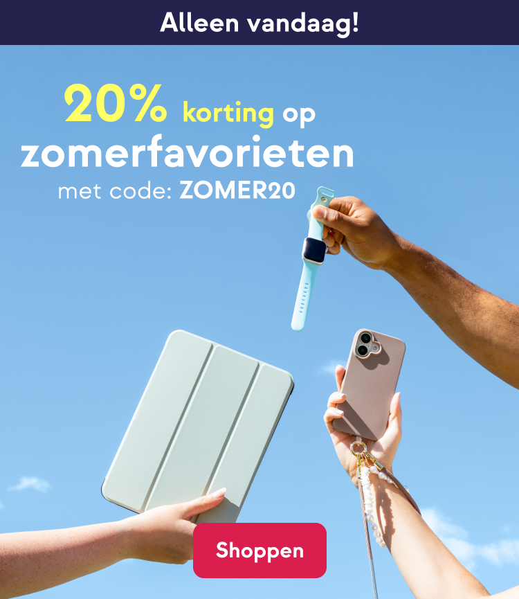 Alleen vandaag 20% korting op al onze zomerfavorieten met de code ZOMER20. Ik ga op vakantie en ik neem mee: een koordhoesje, m'n smartwatch met mijn nieuwe bandje en m'n e-reader. Wat neem jij mee op vakantie?  |