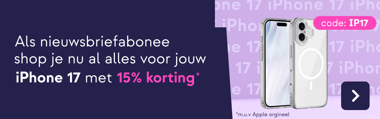 Shop nu hoesjes en screenprotectors voor de iPhone 17-serie met 15% korting met de kortingscode IP17.   |   |  *M.u.v. Apple Orginal. De code is geldig t/m 23 september. Bekijk hier de actievoorwaarden.  |